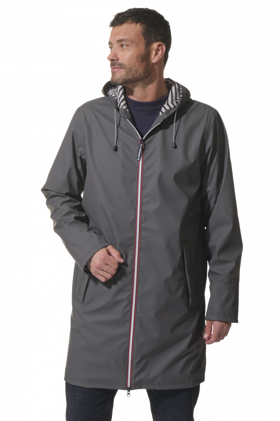 Ciré long au style urbain, conçu pour affronter la pluie sans compromis : extérieur 100% polyuréthane, doublure polaire, coutures thermosoudées et double zip haut/bas pour plus d’aisance (vélo, marche). Capuche à doublure rayée et manchons façon mitaine pour bloquer l’eau au poignet.