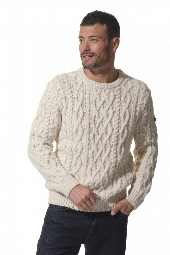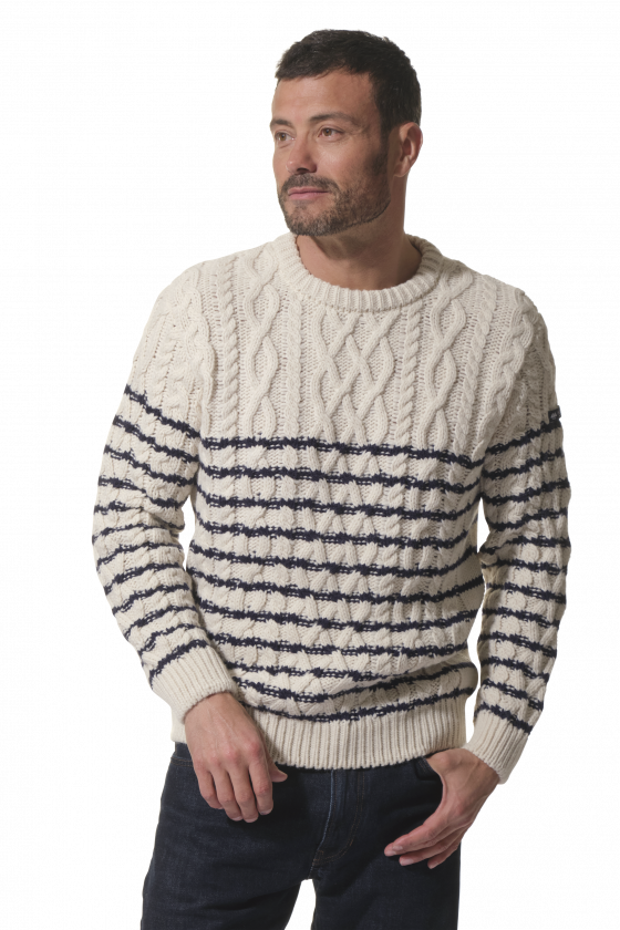 MAXIME : pull col rond en maille torsadée. Écru/Marine ou Écru. S–3XL – 85 €. Style marin intemporel : torsades en relief, coupe classique, chaleur au quotidien. Pull torsadé Hublot : confort, texture soignée, facile à associer tout l’hiver.