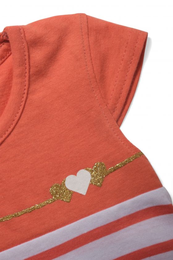 Le tee-shirt FRANNE HUBLOT est un modèle fille plein de pep’s : un col rond, des manches courtes, un style block color avec rayures en bas et une jolie animation cœurs sur la poitrine. Confectionné en jersey 100% coton (165 g), il est agréable à porter tout l’été et facile à associer avec un short, un jean ou une jupe.