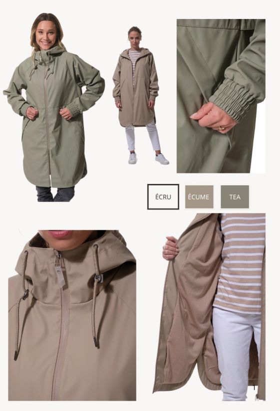 Ce ciré est conçu pour résister aux pluies du quotidien (imperméabilité 4000 mm), en ville comme en bord de mer. Il s’agit d’un vêtement de pluie de loisir, non destiné à un usage technique ou sportif intensif.