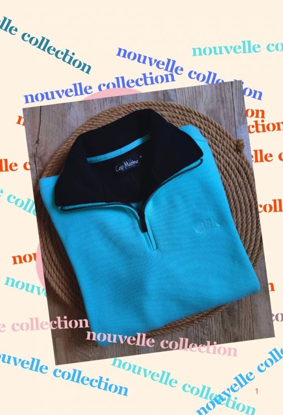 | Finitions | Bord-côtes manches & bas de corps + broderie “Cap marine” manche droite |