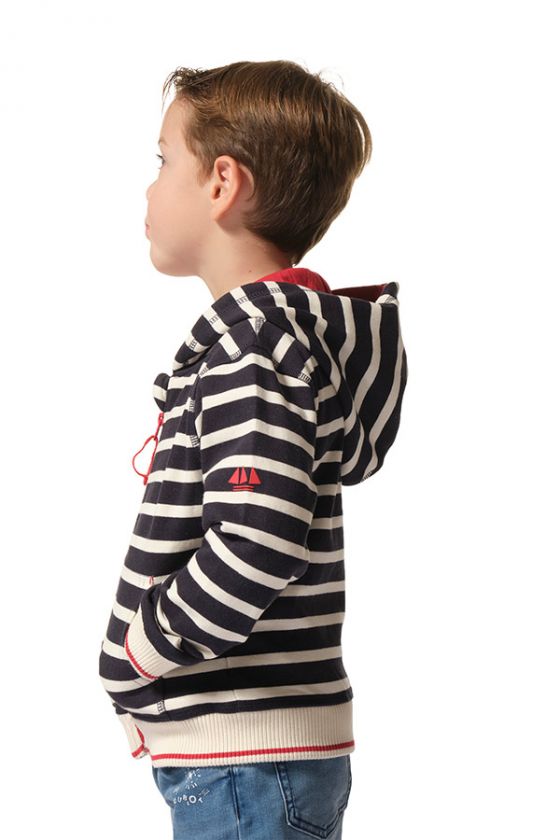 | Détails | Capuche • Poche kangourou • Fermeture éclair rouge • Style marinière |