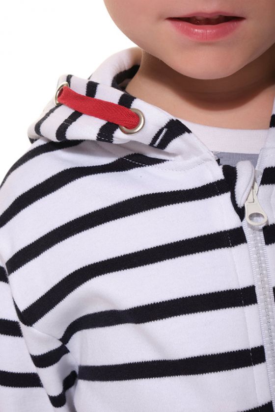 Rif.: D42ANDYENFLa veste ANDY HUBLOT est une pièce enfant pratique et pleine d’esprit marin. Réalisée en coton interlock, elle offre une matière douce, souple et confortable au quotidien. Son look rayé, sa fermeture zippée, sa capuche et ses poches passepoilées en font un indispensable facile à porter, aussi bien pour les filles que pour les garçons. On aime particulièrement le petit ruban rouge de serrage avec œillets dans la capuche, un détail contrasté qui apporte une touche dynamique à ce modèle marin intemporel.