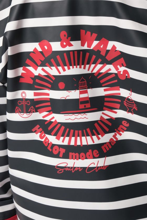 Rif.: D62GREGOIREENFLe ciré GREGOIRE HUBLOT est une belle nouveauté de la collection été 2026. Inspiré de l’univers sailing, ce modèle garçon séduit par son PU rayé, son style marin affirmé et sa grande praticité. Avec sa capuche, sa fermeture zippée et ses deux grandes poches à rabat, il accompagne les petits aventuriers dans toutes leurs sorties, même quand le temps change. Son animation dans le dos donne beaucoup de caractère au modèle, tandis que la matière en 100% polyuréthane protège efficacement de la pluie. Un ciré enfant à la fois fonctionnel, original et facile à porter.