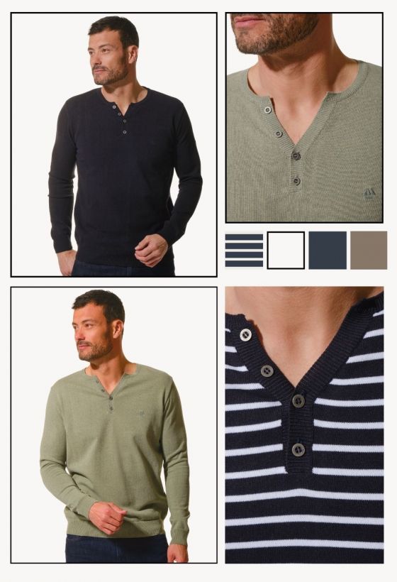 Élégance décontractée et confort moderne : OWEN associe une maille fine douce à un col tunisien boutonné. Facile à porter du bureau au week-end, en jean ou pantalon habillé. Prix : 64,00 € Oui, la maille légère assure chaleur et respirabilité pour le printemps et l’automne. Coupe droite. Entre deux tailles, prenez la taille au-dessus si vous souhaitez un porté plus décontracté.OWEN – Pull homme col tunisien (Hublot) Ref. G52OWEN