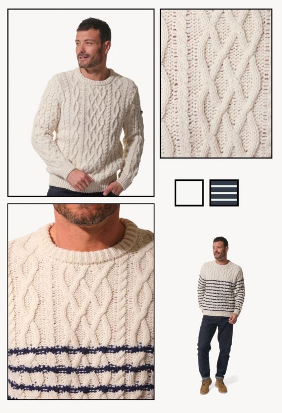 Rif.: G52MAXIMEHMAXIME : pull col rond en maille torsadée. Écru/Marine ou Écru. S–3XL – 85 €. Style marin intemporel : torsades en relief, coupe classique, chaleur au quotidien. Pull torsadé Hublot : confort, texture soignée, facile à associer tout l’hiver.
