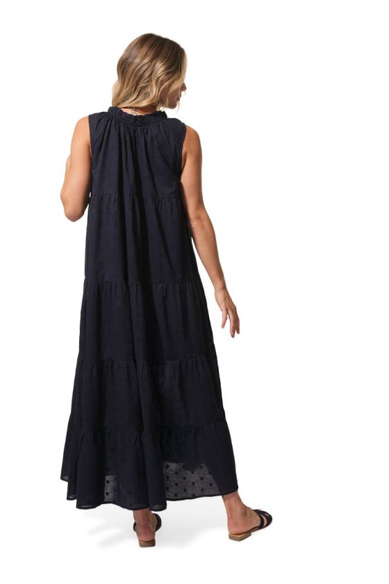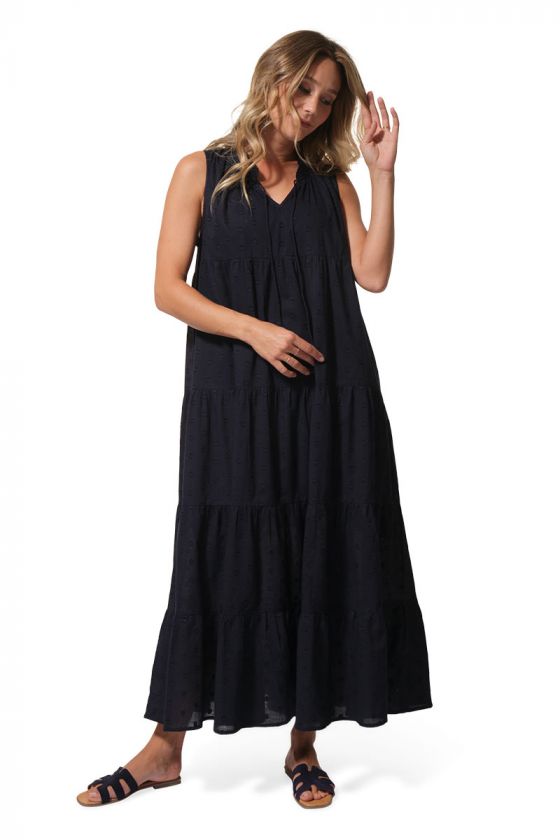 Réf.: D62AMELLa robe longue AMEL séduit par sa silhouette fluide, son tissage jacquard motif cœur et ses jolis détails féminins. Sans manches, agrémentée de volants et d’un cordon avec pompons à l’encolure, elle est confectionnée en 100% coton pour un porté léger et agréable. Une belle pièce de la nouvelle collection été 2026, disponible en marine et baie.