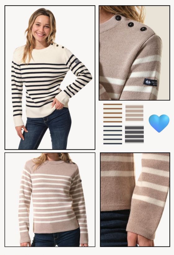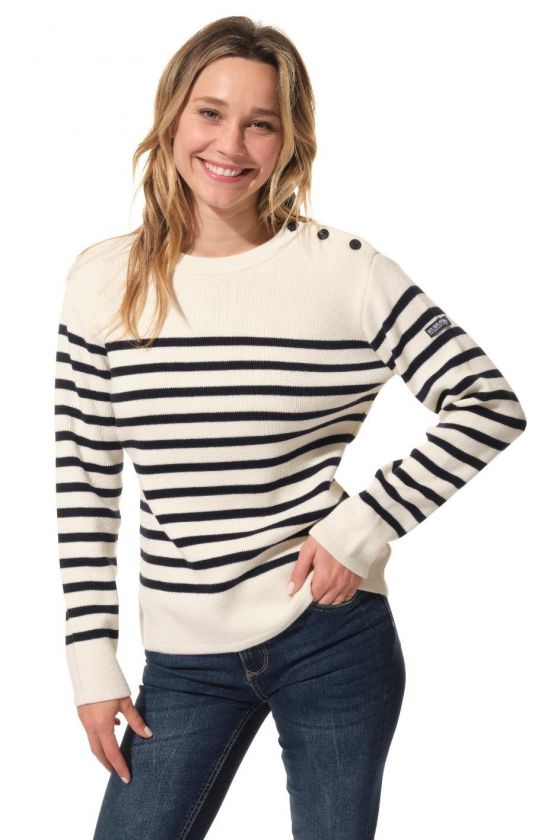 Réf.: G52ANDROMEDEANDROMÈDE : pull marin femme col rond avec boutons d’épaule. Maille 70% acrylique / 30% mérinos. XS–XXL. Style marin intemporel : rayures, coupe féminine et confort tout au long de la journée. Coloris : Écru/Ambre, Écume/Écru, Écru/Marine