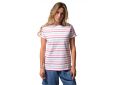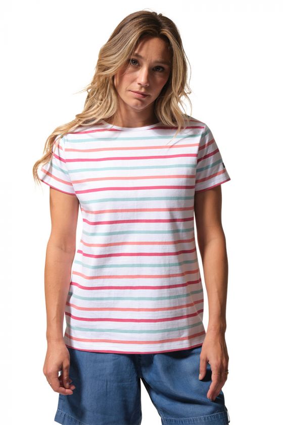 Réf.: D62CAROLINAMarinière femme manches courtes avec encolure bateau, rayures tricolores et petites fentes côtés. Une pièce estivale féminine et colorée, en promotion.