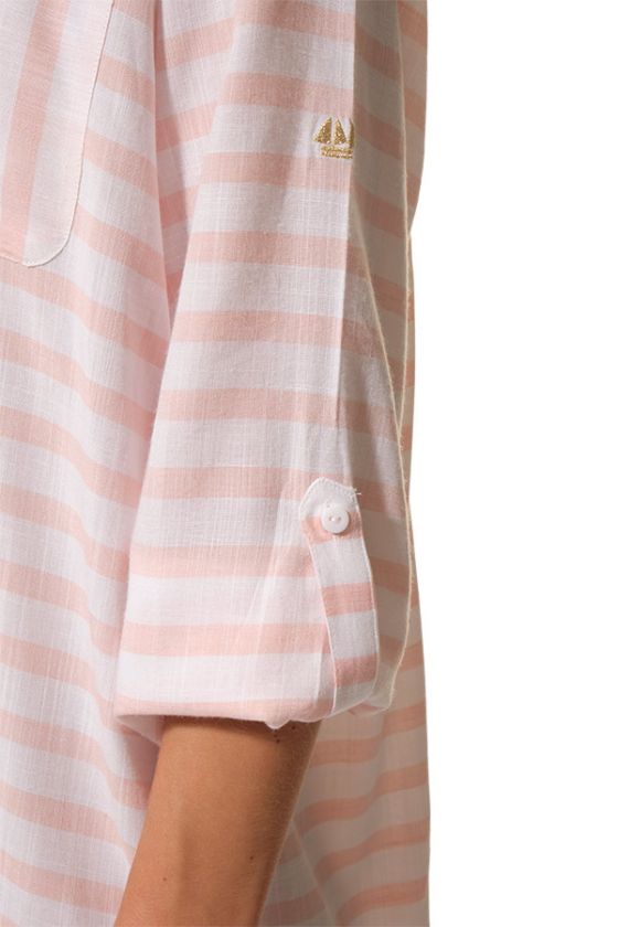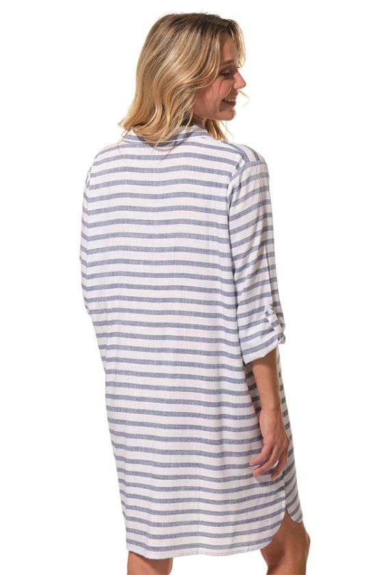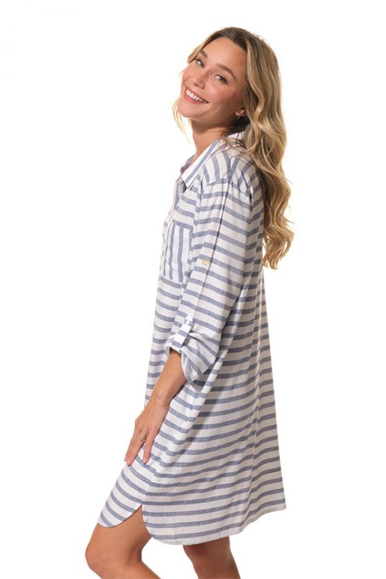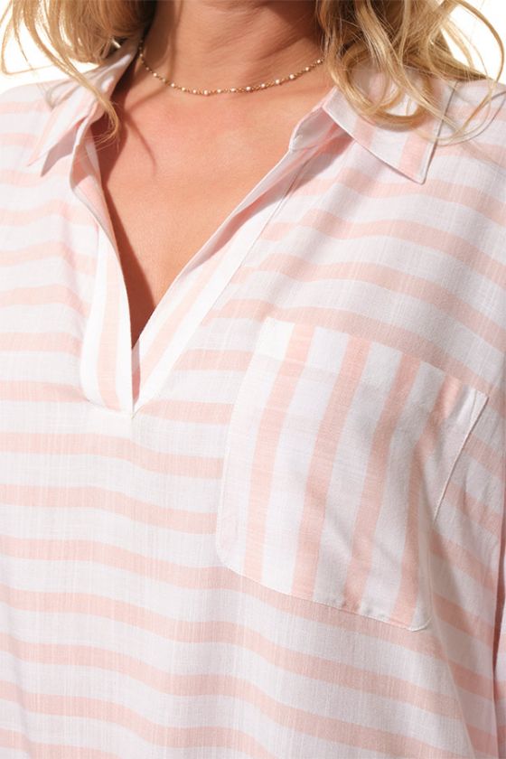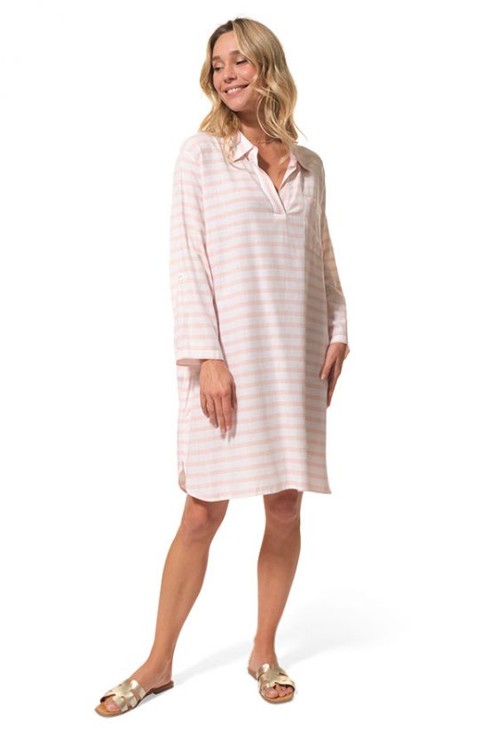 Légère, fluide et décontractée, la robe EVANNA séduit par son esprit chemise revisité et sa coupe ample très agréable à porter. Avec son col chemise, son décolleté V esprit polo, sa poche poitrine et son joli tissu rayé, elle incarne une silhouette estivale à la fois simple, féminine et élégante.