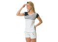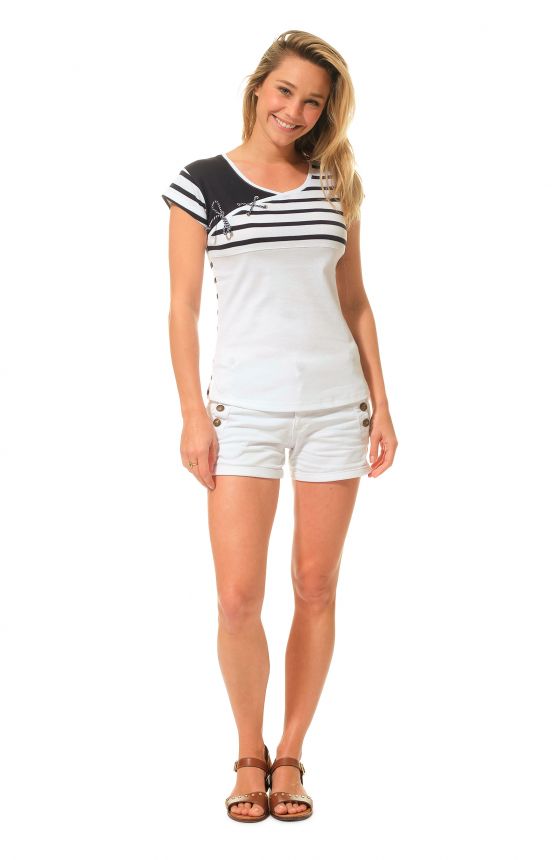 Réf.: F801FTee-shirt femme en 100% coton, avec manches courtes, encolure ronde, rayures marines et petit nœud poitrine. Une pièce féminine et facile à porter.