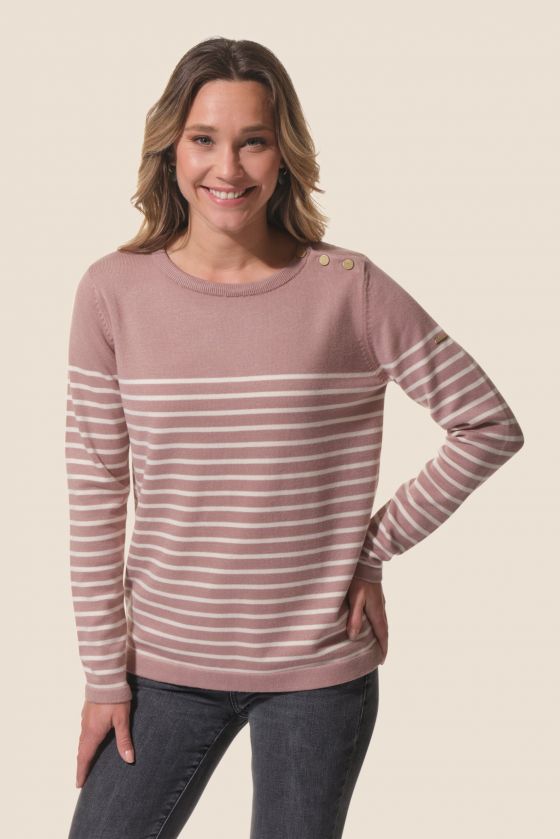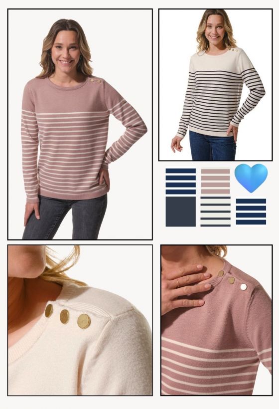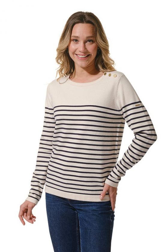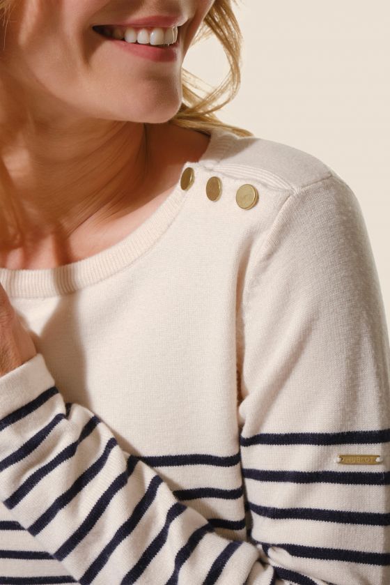 Pull femme col rond avec boutons d’épaule (côté gauche), coupe droite et maille douce. Un basique chic facile à porter au quotidien. Oui, maille douce et agréable au porté. Lavage machine basse température, cycle délicat, retournez le pull et fermez les boutons. Oui, choisissez votre taille habituelle. Parfait pour le printemps/automne, se superpose facilement. Non, ils sont décoratifs.GABRIELLE – Pull marin rayé femme col rond (Hublot) Ref. G52GABRIELLE