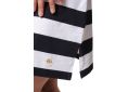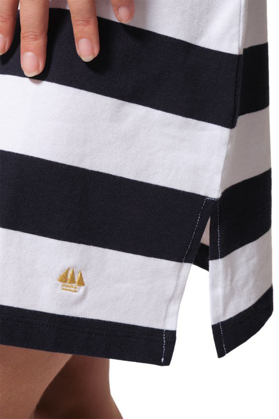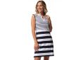 Robe courte sans manches en jersey, avec col V esprit polo, rayures marinières et broderie bateau dorée. Prix promo 75€ au lieu de 95€.
