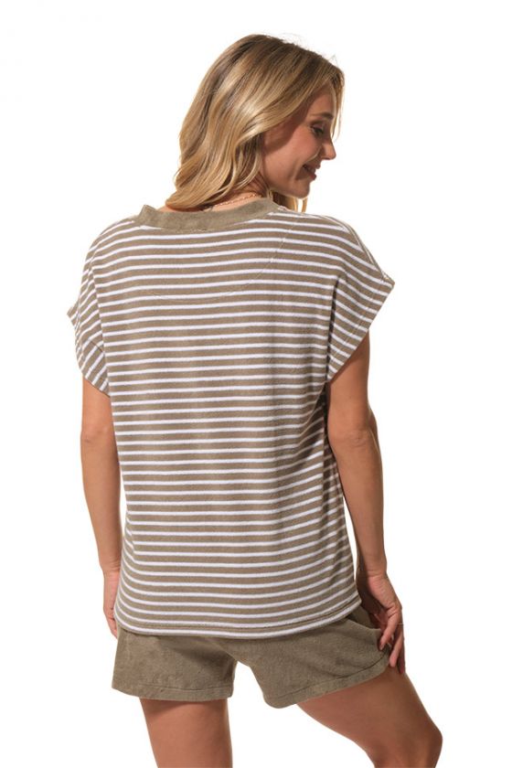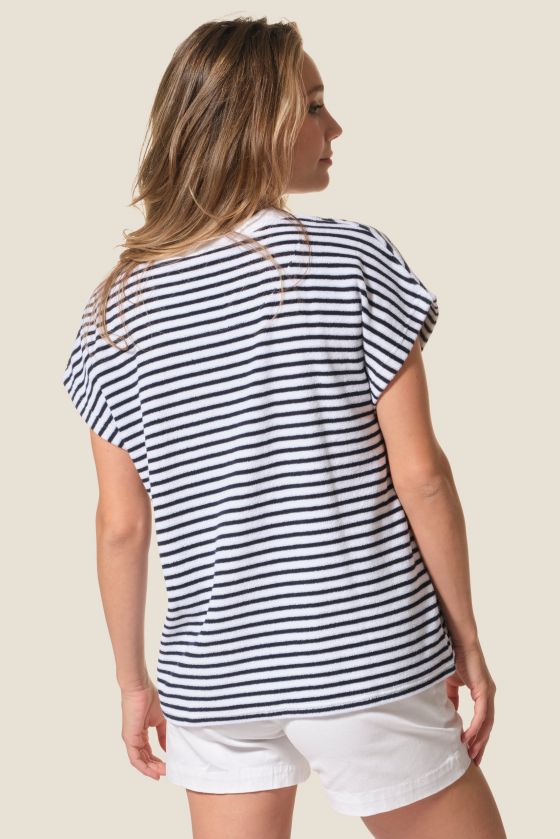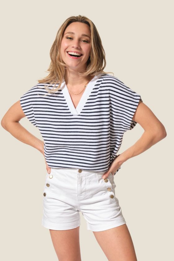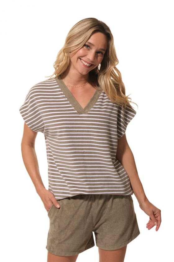 Décontracté, confortable et parfait pour l’été, le tee-shirt MALWINA séduit par sa matière éponge douce et son style facile à vivre. Avec ses manches courtes, son encolure V et ses coloris unis ou rayés, il accompagne naturellement les journées ensoleillées avec une allure simple et féminine.
