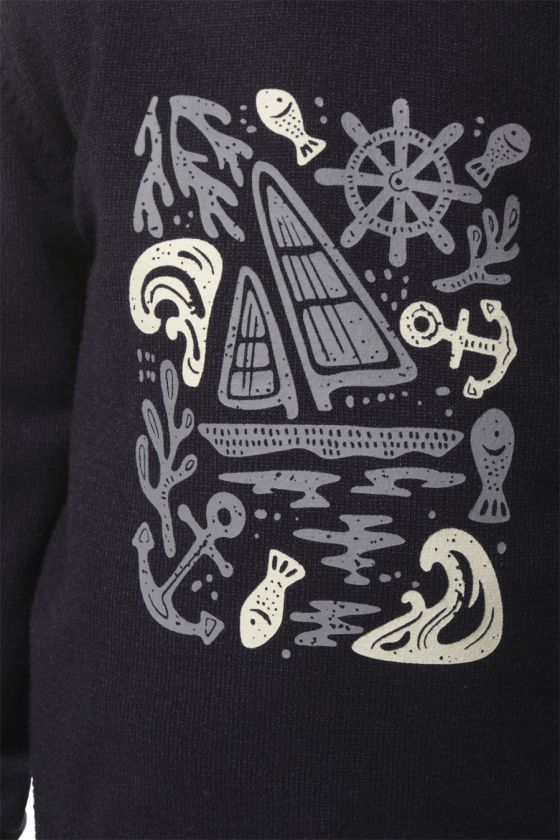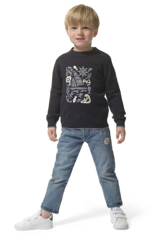Pull enfant à col rond avec boutons à l’épaule et motif marin (bateau/voilier & coquillages) sur la poitrine. Maille douce et résistante pour le quotidien.