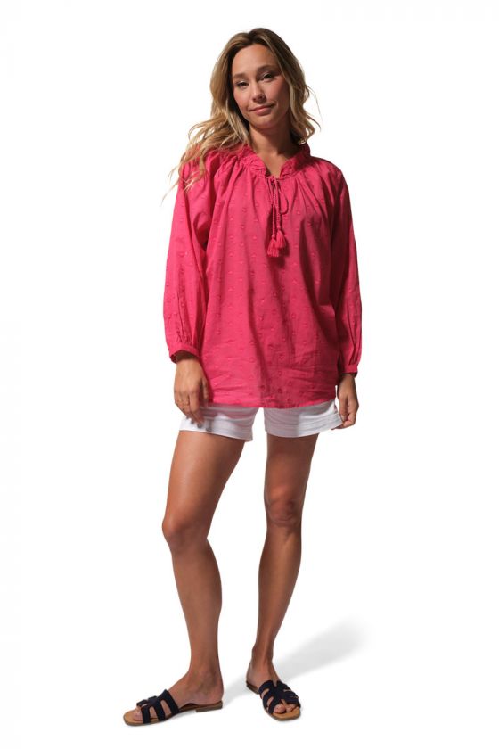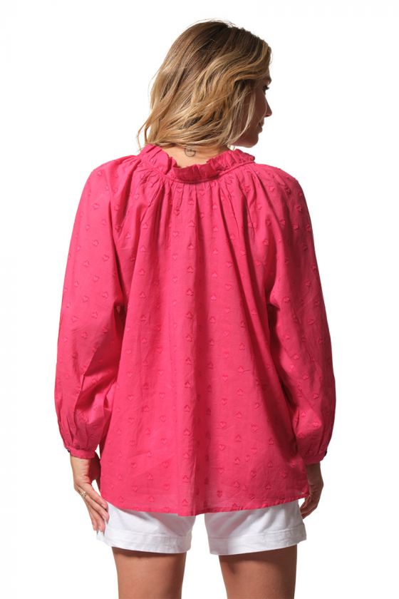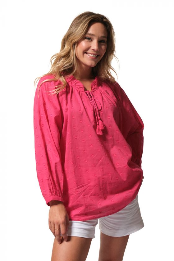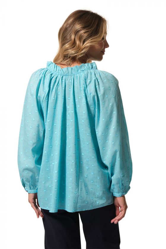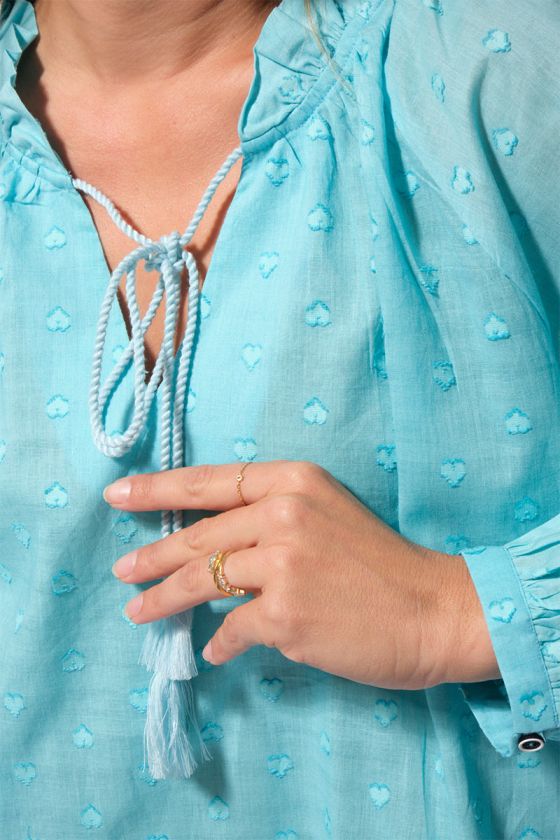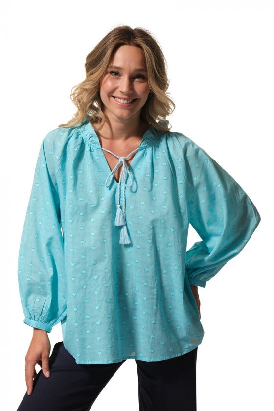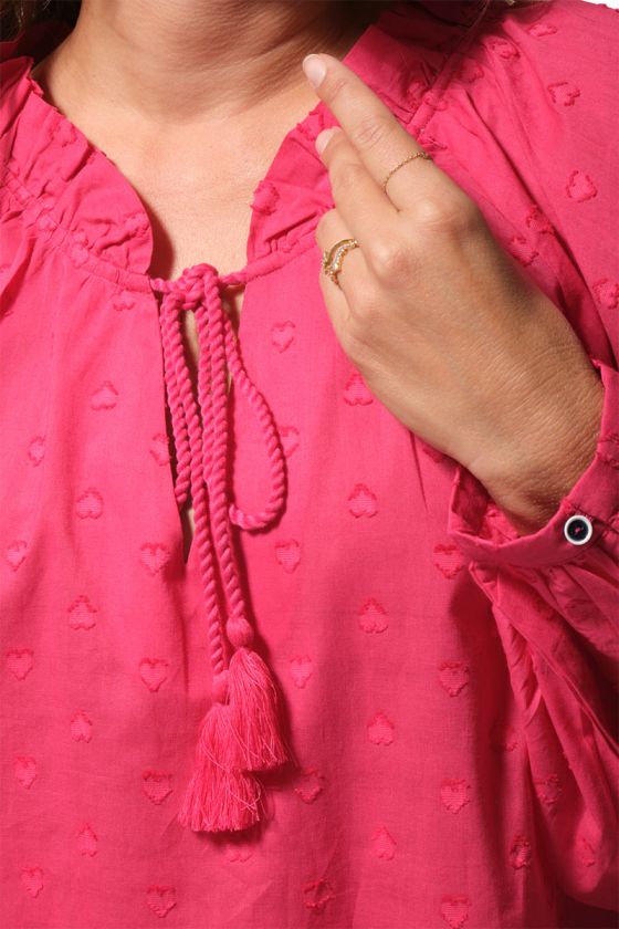 Romantique, légère et raffinée, la blouse PHILIPA séduit par son tissu jacquard délicat et sa belle encolure fantaisie. Avec ses manches longues légèrement bouffantes, ses liens terminés par des pompons et son motif cœur tissé, elle apporte une touche féminine et poétique au vestiaire estival.