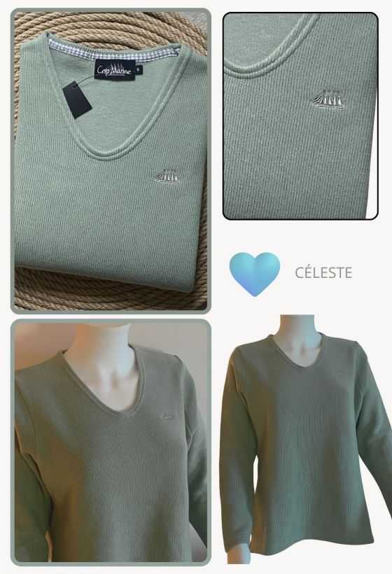 Réf.: CMAURECELESTENouveauté de Cap Marine Sweat AURE avec son col V CÉLESTE Nouveauté Collection CAP MARINE Découvrez le pull femme col V AURE de Cap Marine : douceur et légèreté avec intérieur coton gratté, disponible en plusieurs couleurs pour la mi‑saison.