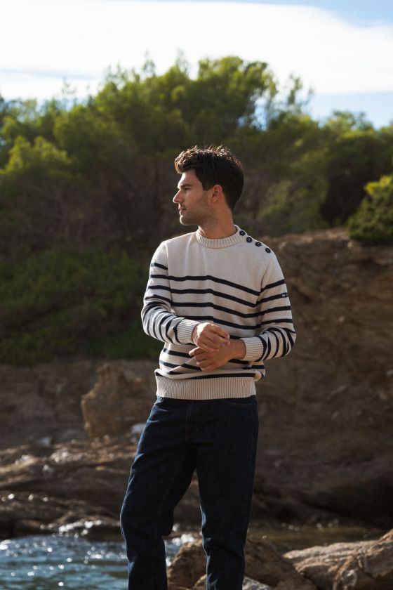 Description du produit : Pull marin avec 3 boutons à l’épaule et une partie unie dans le haut du buste.